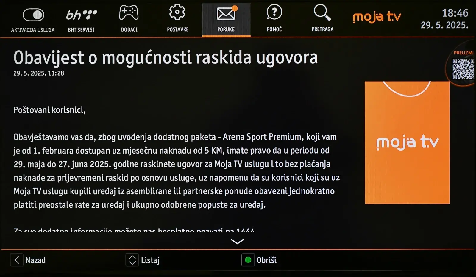 Korisnici usluge Moja TV imaju pravo da u periodu od 29. maja do 27. juna 2025. godine raskinu ugovor bez plaćanja naknade za prijevremeni raskid usluge.